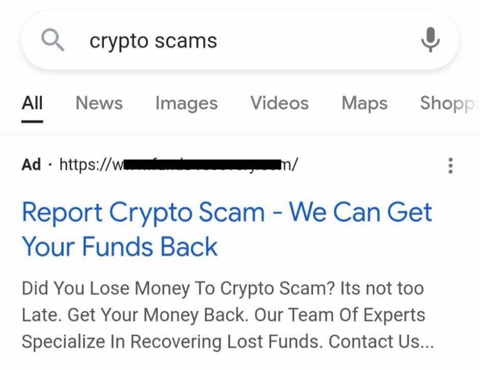 - Scam victims see advertisements in search results or read accounts of successful recoveries on Reddit or Twitter and contact the scam organization to recover their cryptocurrency.