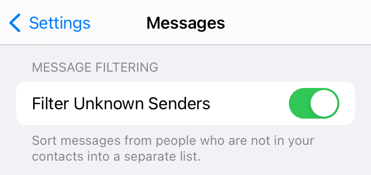 This will now move to a separate inbox any text messages from senders not on your contact list or found in your emails. You can find these messages in the Messages app under Filters > Unknown Senders.