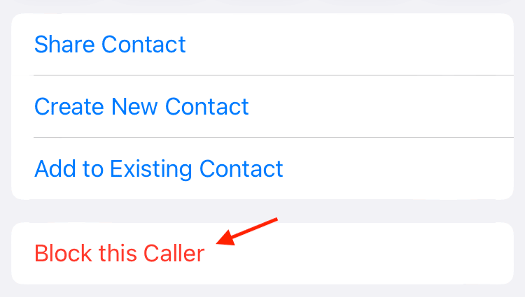 On the next screen, select “Block this Caller” and tap “Block Contact” in the following pop-up.