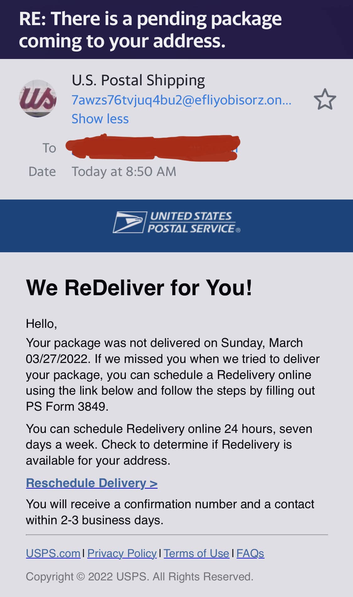 Before you click on a link, check the “From” email address. Is it from the actual company? If not, it’s a scam.